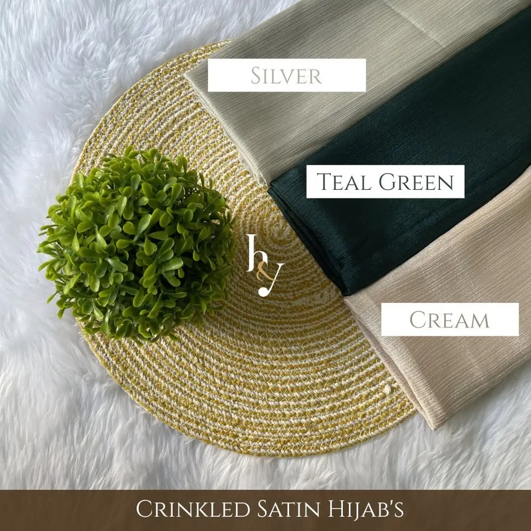 Elevate your hijab collection with our sophisticated Crinkled Satin Hijab in three elegant shades – Silver, Teal Green, and Cream! This stunning trio offers the perfect balance of contemporary style and timeless grace for the modern hijabi.